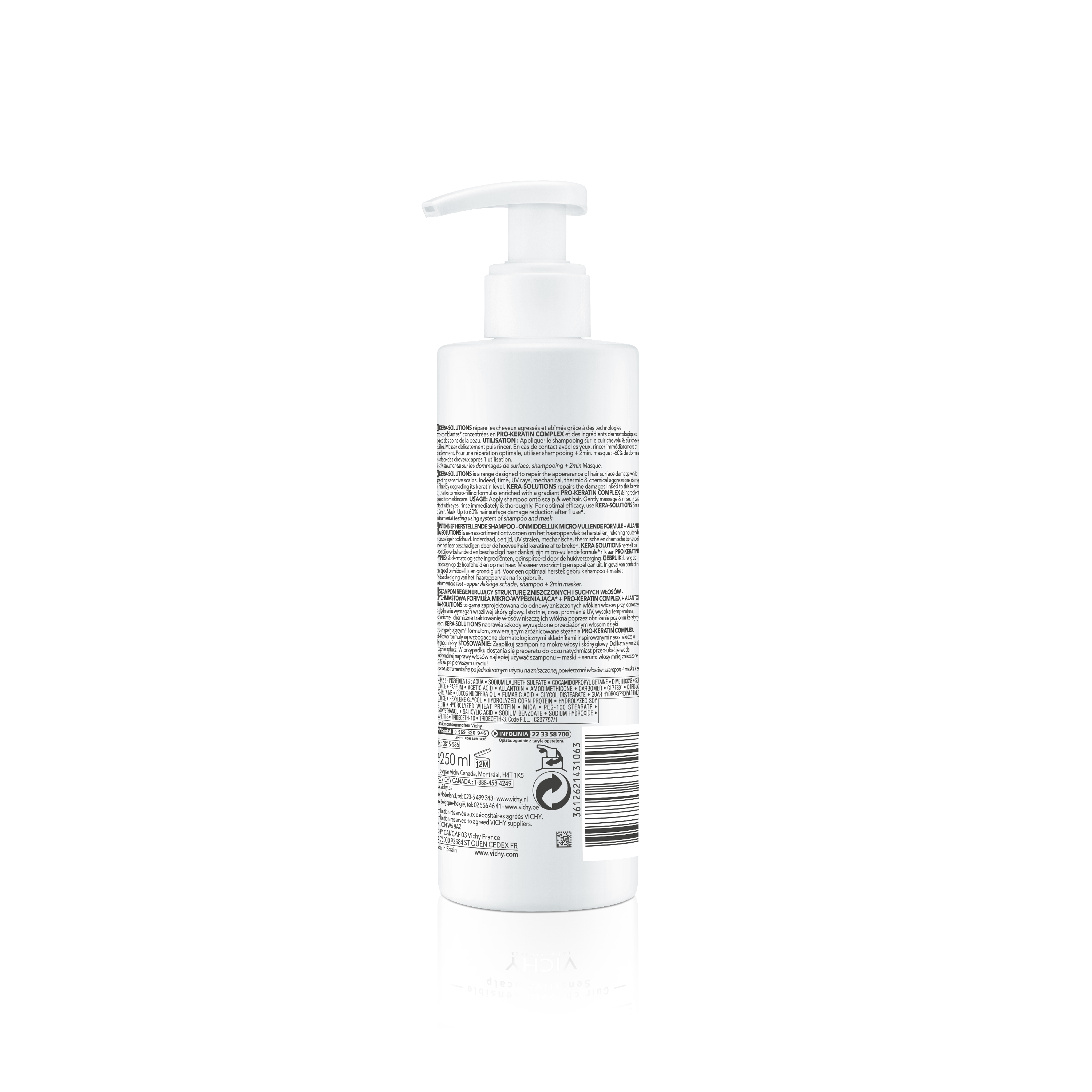 Geschädigtes, kaputtes Haar? Das Kera Solutions Shampoo von Dercos repariert die Faser in der Tiefe mit 2% konzentriertem Pro-Keratin-Komplex, die perfekte Dosis, um das Haar zu reparieren, ohne es zu beschweren, und mit beruhigendem Allantoin für empfindliche Kopfhaut. Das Haar ist weich und geschmeidig, als wäre das Keratin wiederhergestellt worden. Resultat: -63% geschädigtes Haar nach der ersten Anwendung*. Unter dermatologischer Kontrolle getestet, für empfindliche Kopfhaut geeignet. *Instrumenteller Test, nach 1 Anwendung des Shampoos +2min. Maske oder Shampoo +2min Maske + Serum.Anwendung