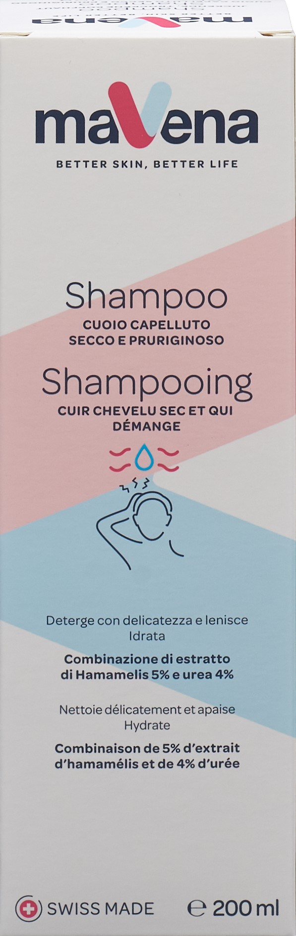 Das milde Mavena Shampoo reinigt sanft, ohne die Kopfhaut auszutrocknen, auch bei täglichem Haare waschen. Das wirkungsvolle Hamamelis mit natürlichen Antioxidantien hilft die juckende & trockene Kopfhaut zu beruhigen und zu schützen.