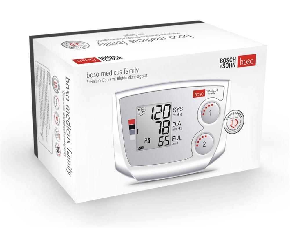 Bodo Medicus Family ist ein sehr beliebtes vollautomatisches Partner-Blutdruckmessgerät mit Auszeichnung. Mit zwei getrennten Speichern a je 30 Messungen ist es ein ideales Partnergerät, wobei zusätzlich auch ein Gastmodus zur Verfügung steht. Darüber hinaus ermöglicht die Auswertung des Blutdrucks eine genaue Beurteilung der Messwerte. Die intelligente Aufpumpautomatik sorgt für eine Messung ohne Nachpumpen, während das grosse Display mit 3-Werte-Anzeige auch Herzrhythmusstörungen anzeigt. Passend für verschiedene Anwender ist dieses Gerät mit einer Universalmanschette für Armumfänge von 22 bis 42cm ausgestattet.
