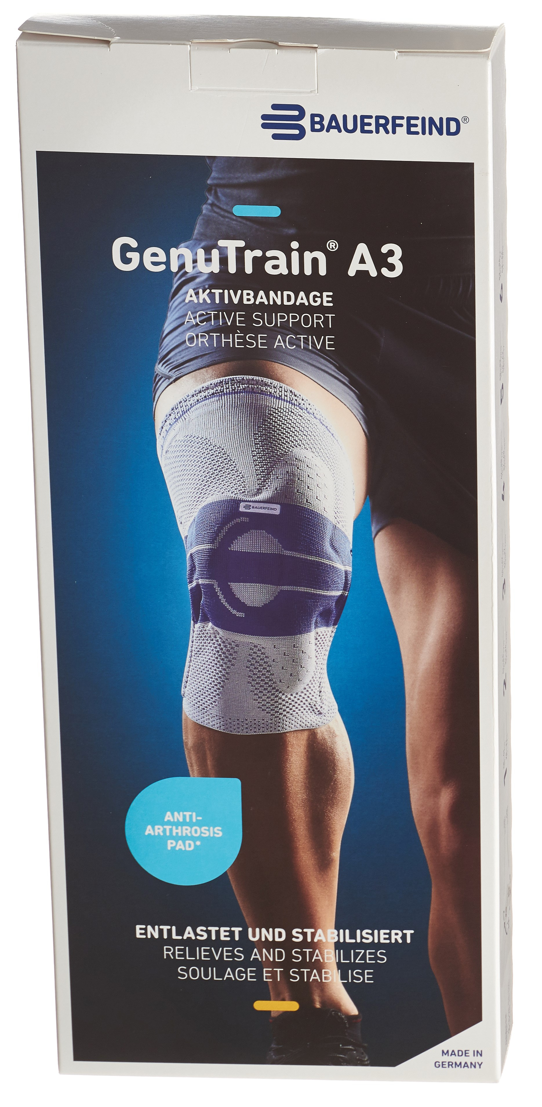 Die GenuTrain A3 Aktivbandage wirkt mittels Wechseldruckmassage an den typischen Schmerzpunkten des Knies. Das dreidimensionale Train-Aktivgestrick unterstützt eine muskuläre Stabilisierung des Kniegelenks, während die integrierte viscoelastische Pelotte ein verrutschen der Kniescheibe verhindert, den Schmerzen entgegenwirkt und das umliegende Gewebe massiert. Auf diese Weise können Ödeme und Ergüsse schneller abgebaut werden. Mit einem weicheren Gestrick in der Kniekehle, druckreduzierten Rändern, atmungsaktiven Materialien und einer der Körperform angepassten elastischen Form werden die medizinische Wirksamkeit sowie ein bequemes Tragegefühl garantiert. Die Haut darunter bleibt dabei angenehm trocken und klimatisiert, nichts schnürt ein.