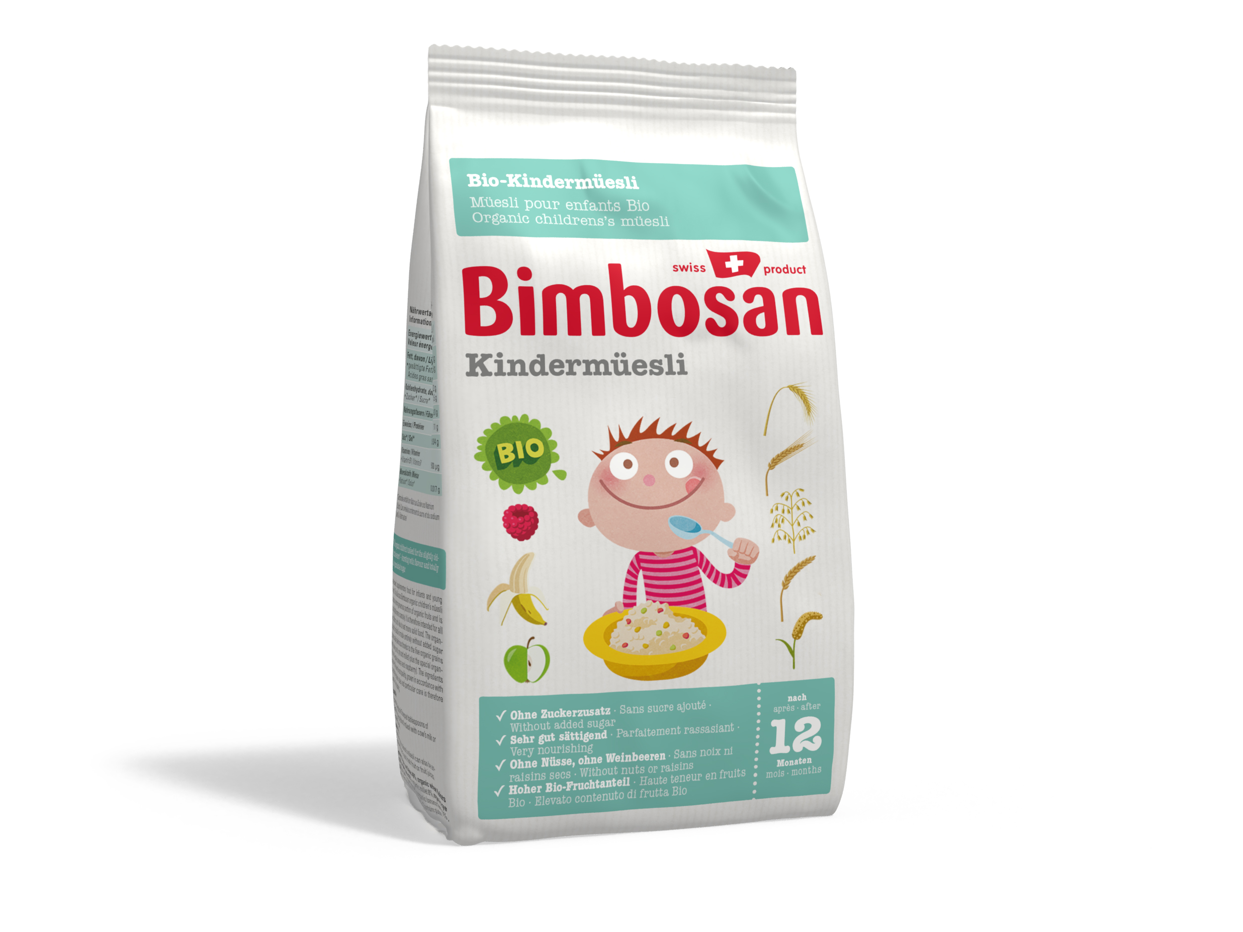 Das feine Bimbosan Bio-Kindermüesli enthält extra viele Bio-Früchte und ist etwas grobkörniger gemahlen. Daher ist es für alle grösseren Kinder gedacht, die gerne schon festere Nahrung zu sich nehmen. Das Bio-Kindermüesli kommt ganz ohne zugesetzten Zucker aus und schmeckt dank den fünf Bio-Getreiden (Weizen, Gerste, Hafer, Roggen und Hirse) sowie dem besonderen Bio-Früchte-Mix (Apfel, Banane und Himbeere) ganz ausgezeichnet. Die verwendeten Inhaltstoffe sind von höchster Qualität und werden nach den strengen Knospe-Richtlinien biologisch angebaut und behandelt.