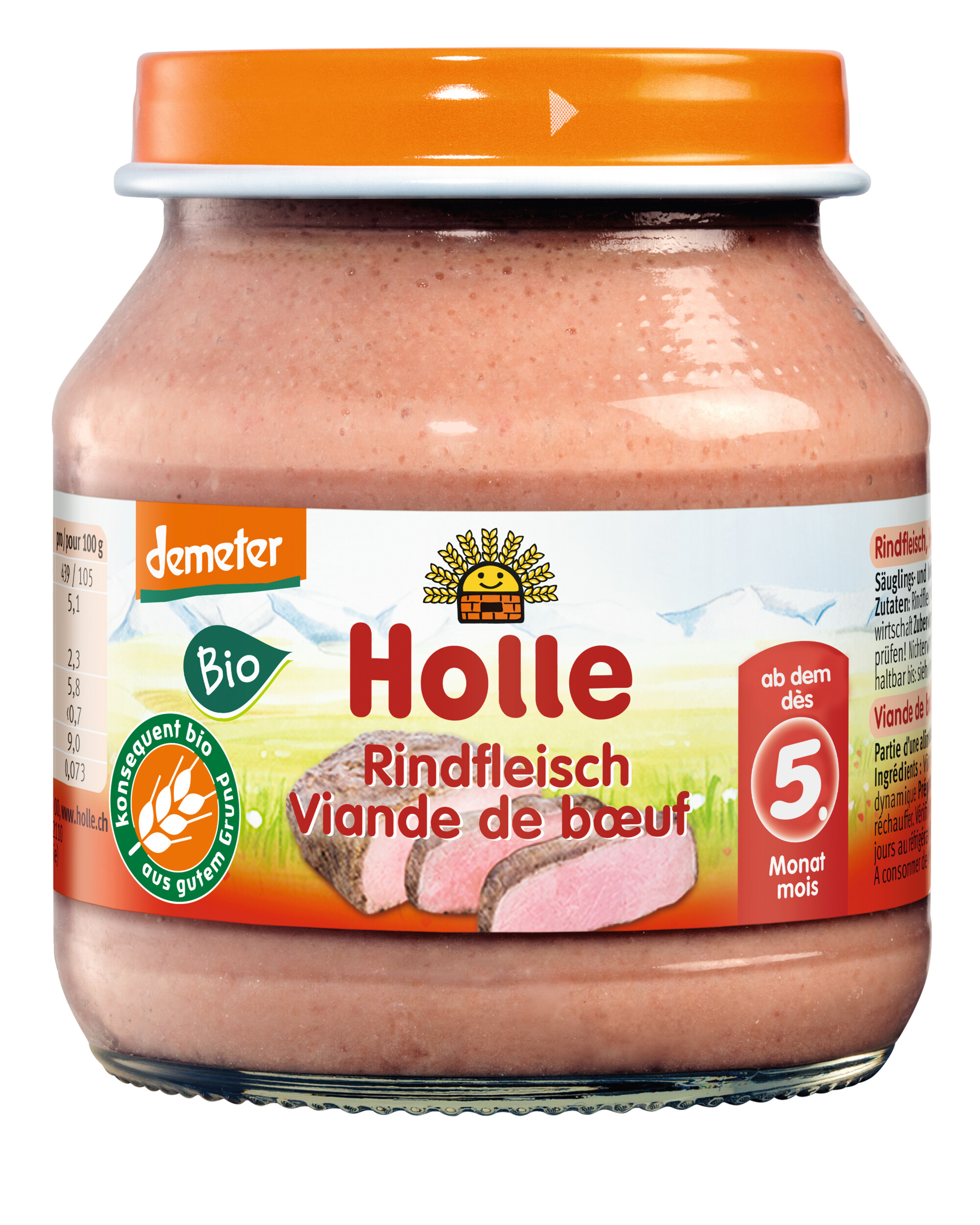 Das allererste Fleisch. Das Babygläschen ist ideal für die Zubereitung des ersten Gemüsebreies mit Fleisch. Das feine Püree des Holle Gläschens lässt sich einfach in den Brei unterrühren. Von den Fachgesellschaften für Kinderernährung wird mind. 5 mal die Woche Fleisch für den Gemüse-Kartoffel-Fleisch-Brei empfohlen.