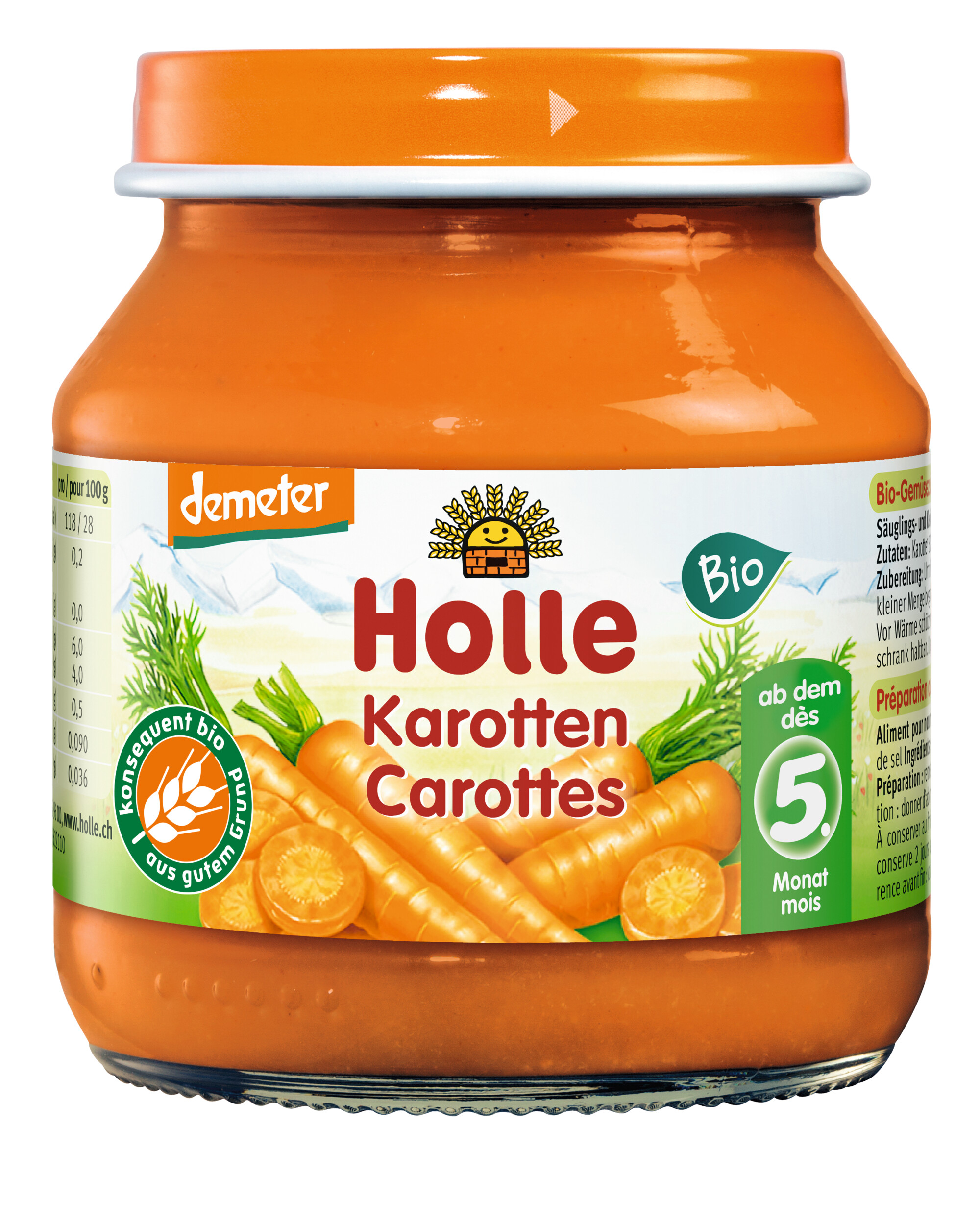 Das Babygläschen Karotte pur eignet sich besonders um mit der Beikost zu starten. Der pure Karottenbrei ist fein püriert und nur beste Demeter-Zutaten aus streng kontrolliertem Anbau werden für die Holle Gläschen verwendet.