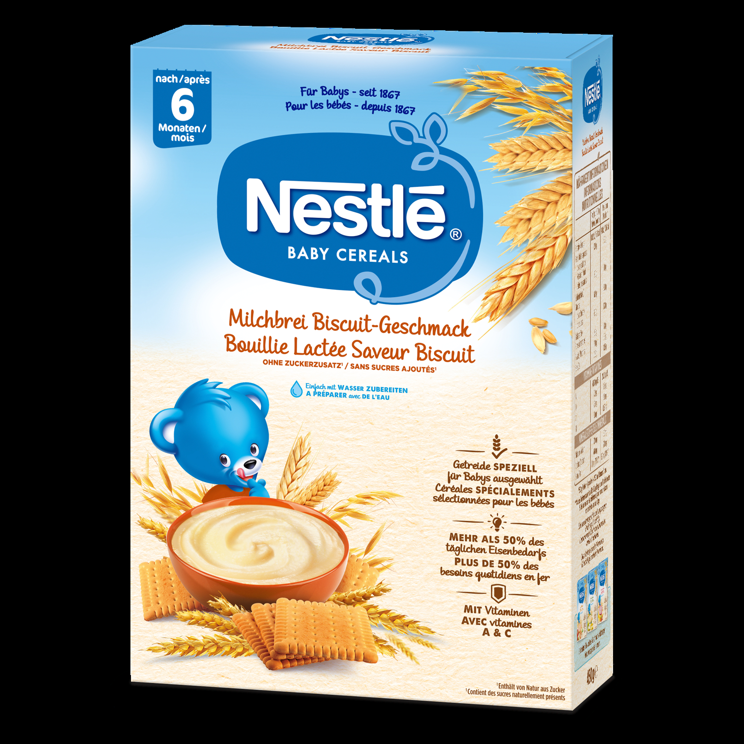 Seit 1867 sind Nestlé Baby-Cerealien von unserer Leidenschaft für Babynahrung und Wissenschaft inspiriert. Ideal für die Einführung der Beikost, unsere Milchbreie sind die beliebtesten Baby-Cerealien der Schweiz*. Entdecken Sie die Sorte Biscuit-Geschmack Cerealien: - Mit Weizen speziell für Babys kultiviert und ausgewählt. - Deckt mehr als 50% des täglichen Eisenbedarfs des Babys, das zur normalen kognitiven Entwicklung von Kindern beiträgt**. - Reich an Vitamin A and C, welche zu einer normalen Funktion des Immunsystems beitragen**. - Das Beste des Getreides ohne Zuckerzusatz*** oder Palmöl. - Schnell zubereitet mit Wasser. *Verkäufe der Cerealien für Babys in Lebensmittelmärkten sowie Apotheken, Nielsen & IQVIA, Marktanteile Jan. - Nov. 2021. **Für eine zubereitete Portion (50 g Pulver + 150 ml Wasser). ***Enthält von Natur aus Zucker. Eine abwechslungsreiche und ausgewogene Ernährung sowie eine gesunde Lebensweise sind wichtig.