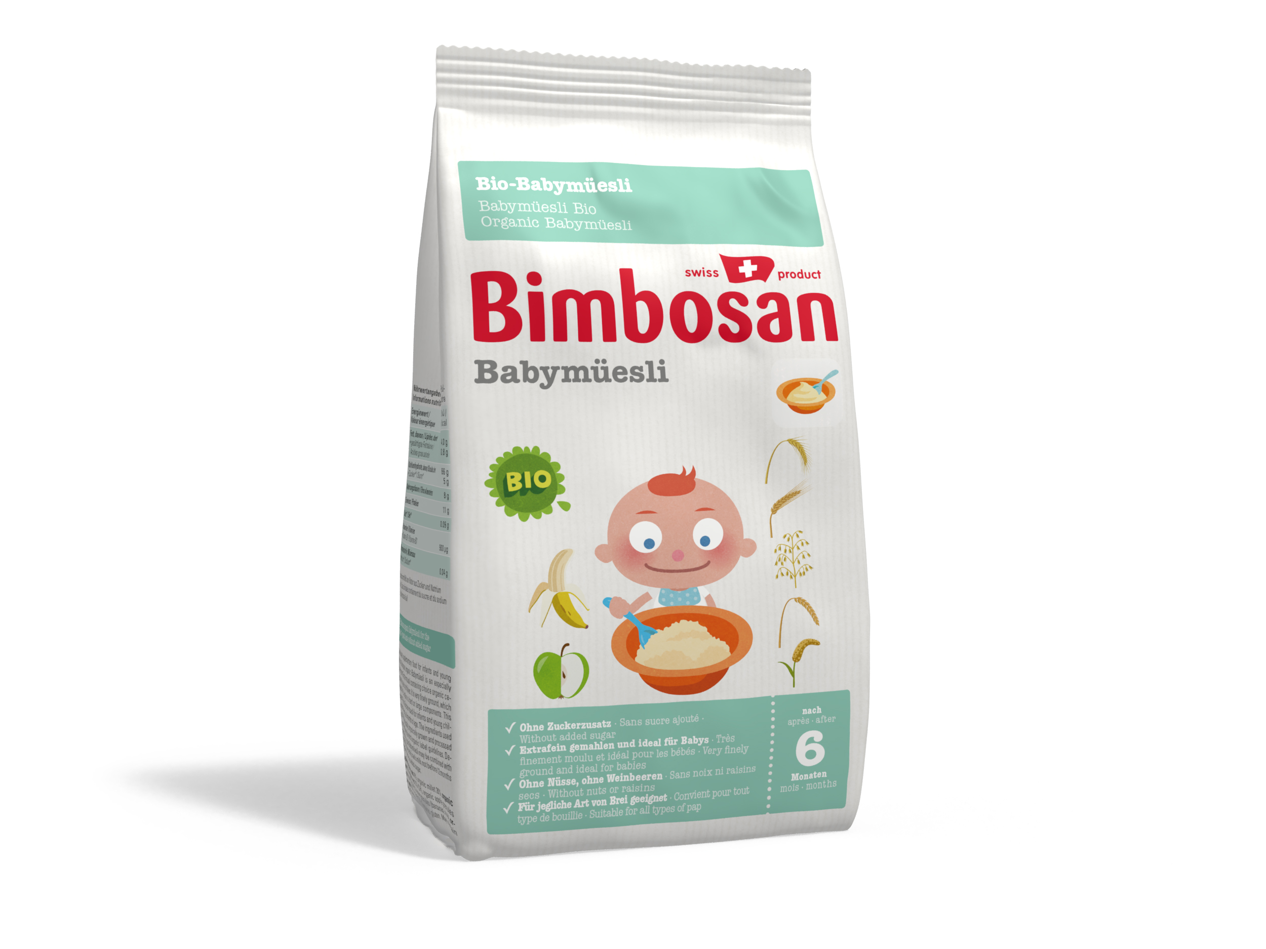 Das nahrhafte und feine Bimbosan Bio-Babymüesli ist ein besonders fein gemahlenes Birchermüesli mit hohem Gehalt an Bio-Getreiden und Bio-Früchteflöcklein. Da es weder harte noch grosse Bestandteile enthält, mögen es Säuglinge und Babies besonders gerne. Bimbosan Bio-Babymüesli kann je nach Alter mit jeder Säuglingsanfangsnahrung kombiniert werden (Kuhmilch frühestens nach 12 Monaten) und enthält keinen Kristallzucker.