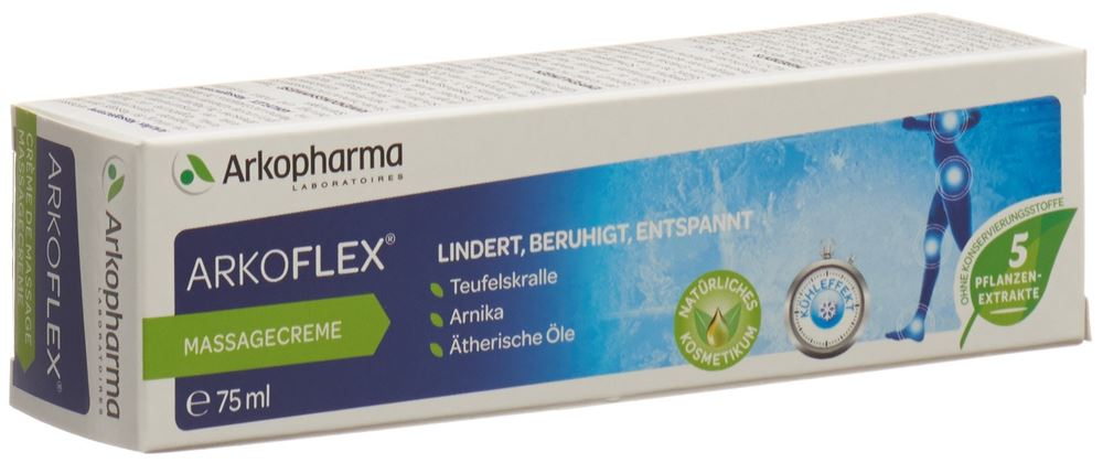 Arkoflex® Massagecreme verbessert die entspannende Wirkung der Massage dank der beruhigenden Eigenschaften der Pflanzen (Arnika, Harpagophytum und Calendula), der beruhigenden Kraft der ätherischen Öle (Gaultherie und Marjolaine) und der erfrischenden Wirkung von Eukalyptol und Menthol.