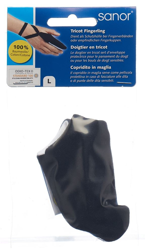 Der Fingerling in der Grösse L wird für Fingerverbände und bei empfindlichen Fingerspitzen eingesetzt. Er besteht zu 100% aus Baumwolle