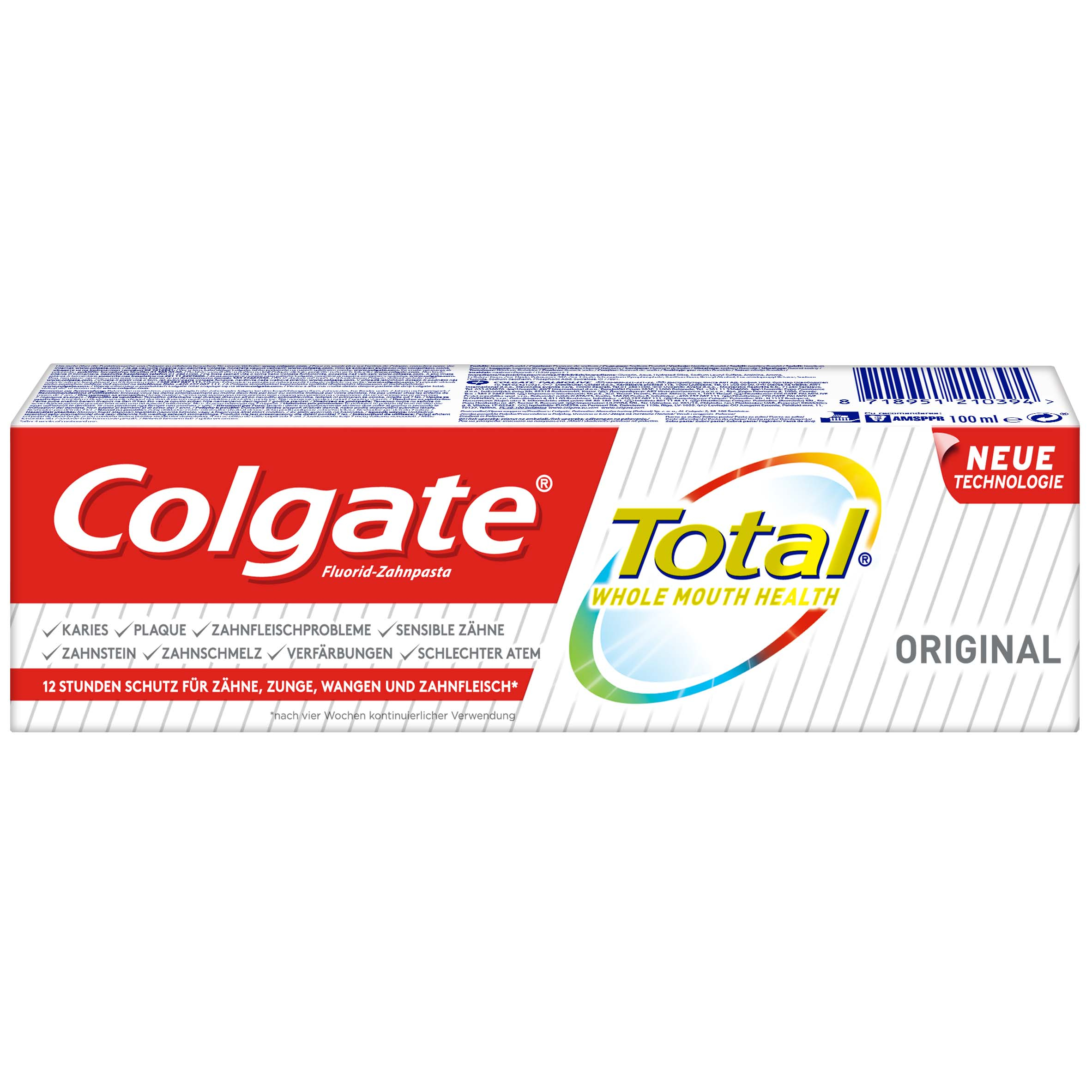Die Colgate Total Original Zahnpasta verfügt über eine fortschrittliche Technologie, die Ihren gesamten Mund proaktiv gegen Plaque, Empfindlichkeit, Verfärbungen; Zahnstein und Karies schützt.