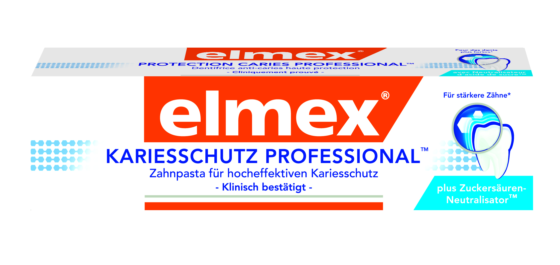 elmex Kariesschutz Professional Zahnpasta mit patentiertem Zuckersäuren-Neutralisator; der die Hauptursache von Karies direkt bekämpft.
