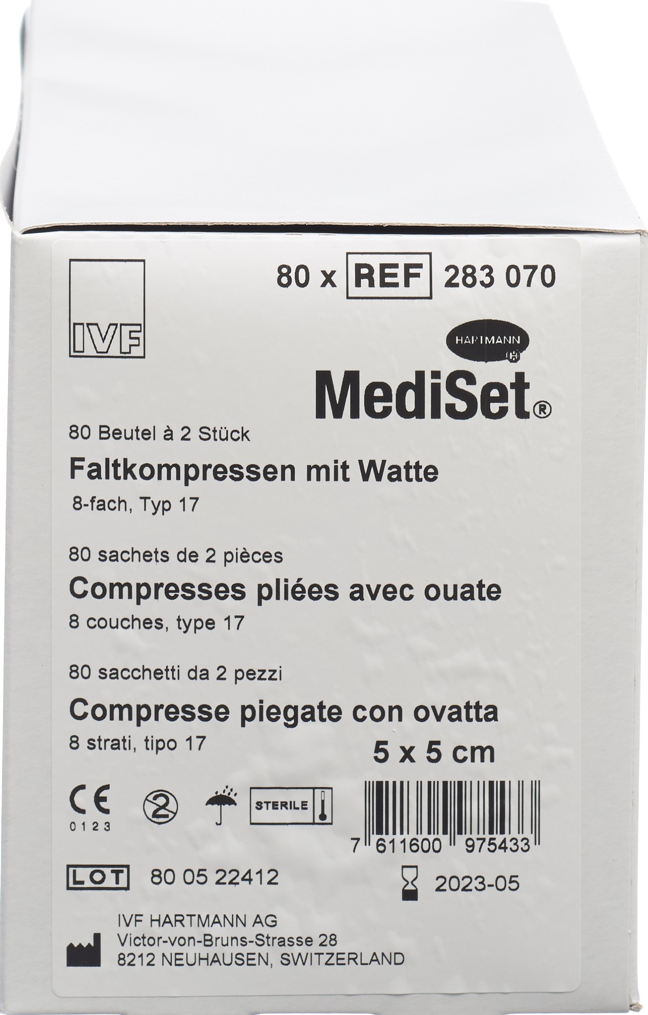 Mediset IVF Faltkompressen aus Watte 5x5cm 8 fach steril 2 Stk