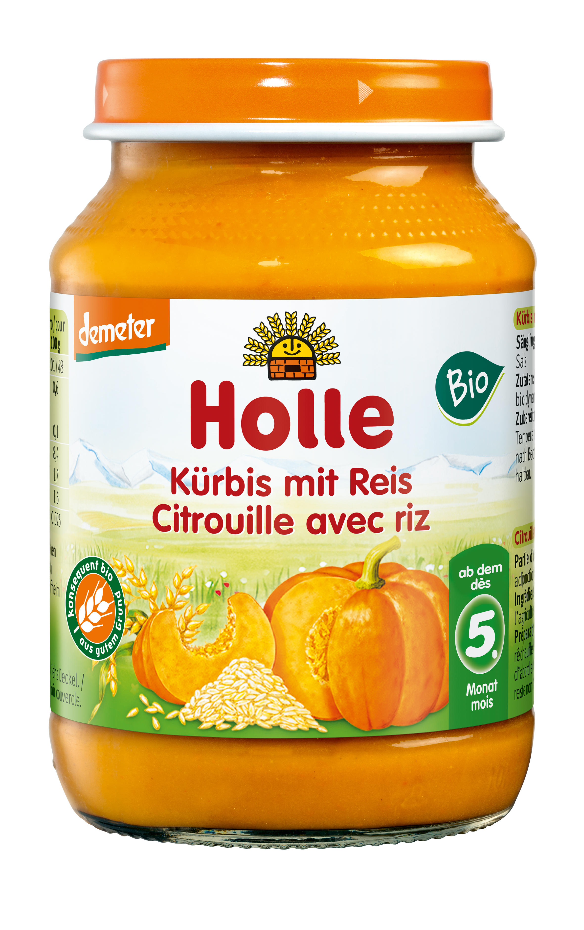 Das Babygläschen Kürbis mit Reis eignet sich besonders für die weitere Beikosteinführung und zur Zubereitung der ersten Menüs, um neue Zutaten kennen zu lernen. Der Gemüsebrei ist fein püriert und nur beste Bio- und Demeter-Zutaten aus streng kontrolliertem Anbau werden für die Holle Gläschen verwendet.