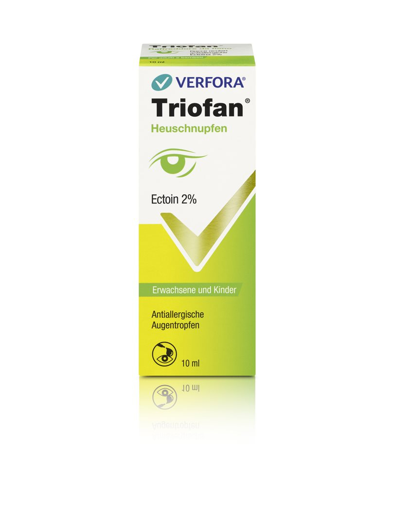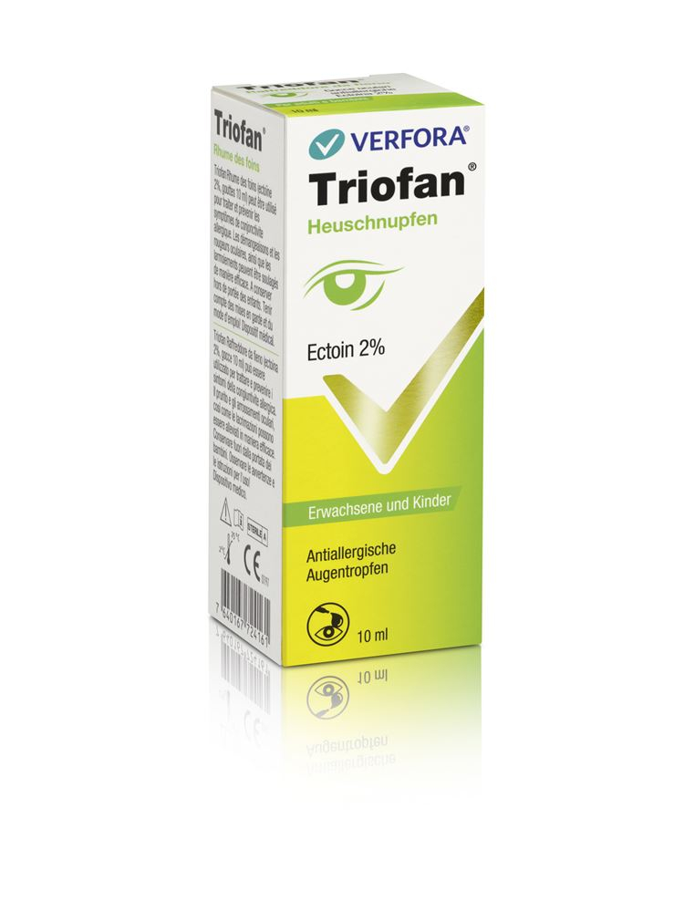 Triofan Heuschnupfen antiallergische Augentropfen ist ein Medizinprodukt, welches 2% Ectoin® enthält, ein natürliches, zellschützendes Molekül, das hilft die Entzündung zu lindern und die Membrane zu stabilisieren.
