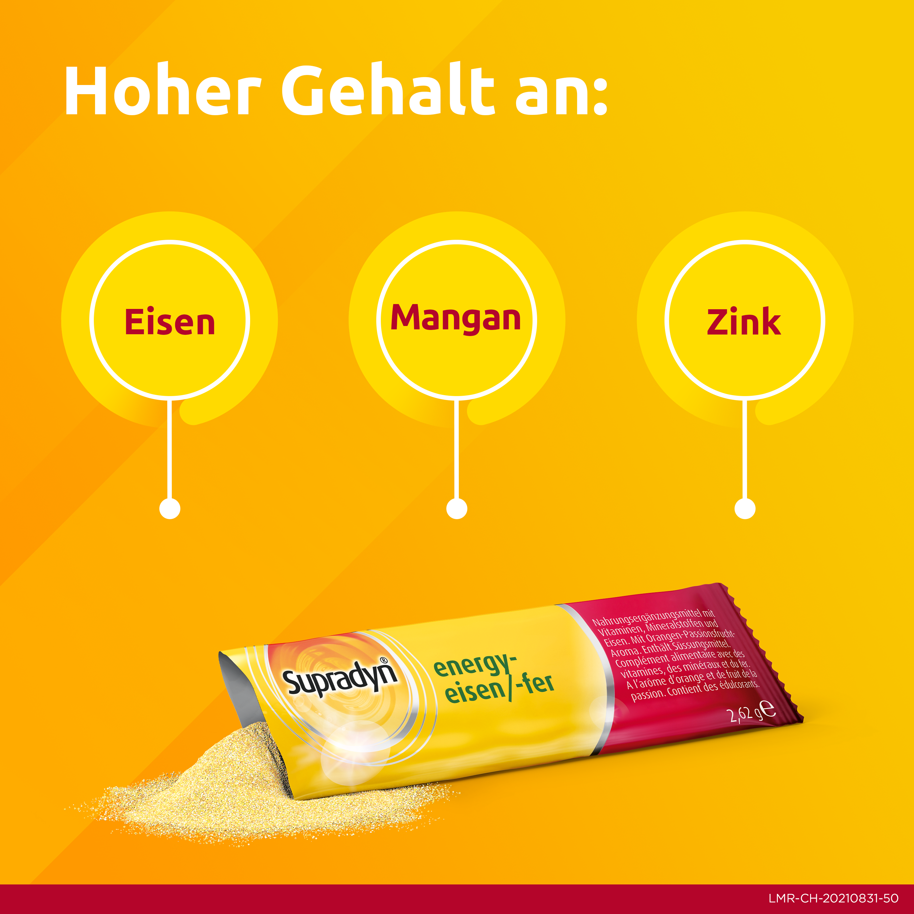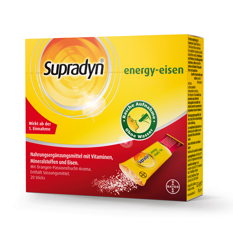 Nehmen Sie Supradyn® pro energy-eisen zur vorübergehenden täglichen Einnahme bei Müdigkeit und zur Unterstützung des Immunsystems. Die Kombination aus allen 13 Vitaminen und 9 Mineralstoffen inkl. extra Eisen versorgt den Körper optimal mit Mikronährstoffen. Eine ausreichende Versorgung mit allen Vitaminen, Mineralstoffen und extra Eisen unterstützt bei Müdigkeit augrund eines aktiven Lebensstils, einer einseitigen Diät und bei Eisenbedarf z.B. wegen Blutverlust bei Menstruation oder eisenarmer Ernährung. Erwachsene und Jugendliche nehmen einen Stick täglich. Ein Stick enhält durchschnittlich 100 % der täglichen Referenzmenge an Vitaminen. Die Filmtabletten lassen sich einfach schlucken. Vitamin B12 trägt zu einem normalen Energiestoffwechsel und zur Verringerung von Müdigkeit bei. Vitamin C, D und Zink tragen zu einer normalen Funktion des Immunsystems bei. Eine abwechslungsreiche und ausgewogene Ernährung sowie eine gesunde Lebensweise sind wichtig für die GesundheitWirkung