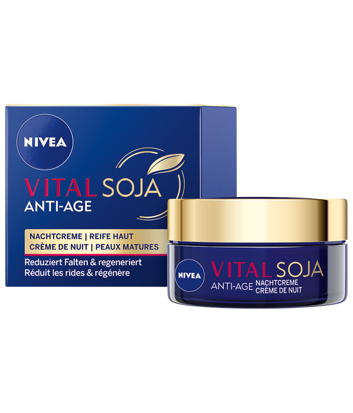 Die Nivea Vital Soja Anti-Age Nachtcreme mit natürlichem Soja-Extrakt reduziert bei regelmässiger Anwendung die Zeichen reifer Haut über Nacht und sorgt für eine verjüngt aussehende Haut, die voller Vitalität strahlt.