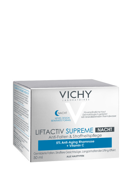 LIFTACTIV SUPREME 50ml Nachtpflege von Vichy ist eine umfangreiche Anti-Falten und Straffheitspflege für die Nacht. Die hochwirksame Formel mildert kontinuierlich die sichtbaren Zeichen der Hautalterung. Dafür kombiniert die Nachtpflege von der Natur inspirierte Inhaltsstoffe mit vulkanischem Wasser aus Vichy. 5 % Rhamnose stimuliert die Kollagen- & Elastinproduktion der Haut und sorgt so für sichtbar gemilderte Falten. Adenosin gibt der Haut Energie und mildert Falten. Die Haut wirk jugendlicher und ist intensiv gepflegt. Die Anti-Aging-Creme hat eine bewiesene Wirksamkeit auf alle wesentlichen Arten von Falten. Selbst tiefe Falten auf der Stirn, an den Augen und am Hals werden gemildert. Für das unvergleichliche Gefühl jugendlicher Haut – geschmeidig prall, straff und strahlend.Anwendung