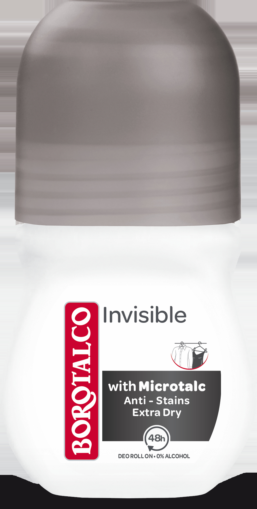 Borotalco Invisible ist die Deo-Linie, die speziell entwickelt wurde, um Ränder und Flecken auf Kleidern zu verringern. Reduziert weisse und gelbe Flecken auch auf empfindlichen Geweben wie Seide. Dank seiner Mikrotalk-Formel absorbiert es den Schweiss und sorgt für ein besonders trockenes Frischegefühl. 0% Alkohol. Dermatologisch getestet Invisible Duft: Florale, leicht ambrierte Duftkomposition mit einem anhaltenden Grundton von Talk.Anwendung