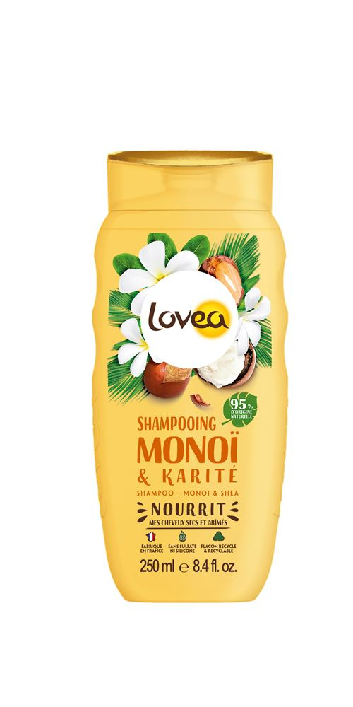 Lovea Shampoo Monoï & Shea ist eine sanfte Haarpflege mit 95 % natürlichen Inhaltsstoffen wie Monoï- und Sheaöl, die sich in einen grosszügigen Schaum verwandelt und trockenes und geschädigtes Haar intensiv pflegt und es weich und strahlend macht.
