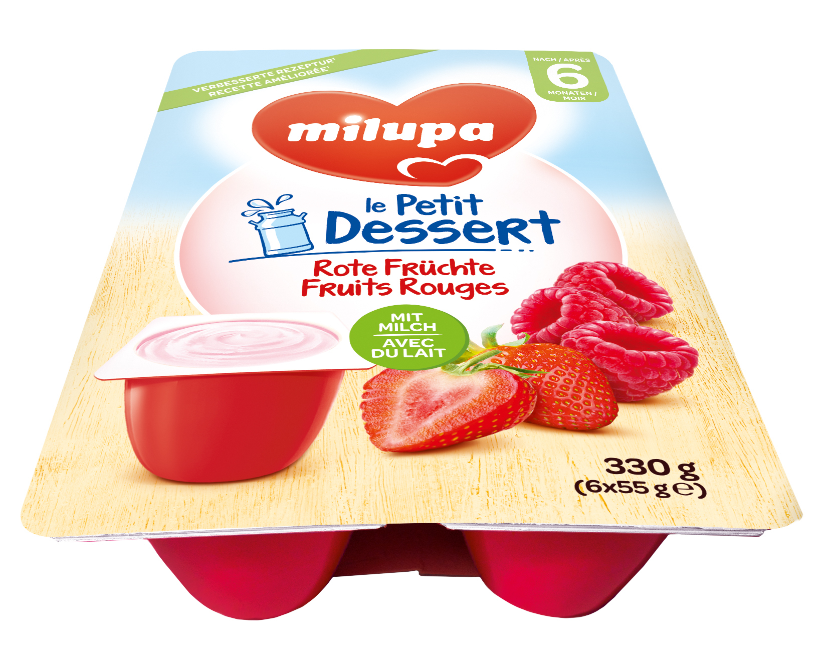 Produkt aus Babygerechter Milch, Erdbeeren und Himbeeren, als Zwischenmahlzeit oder Dessert.