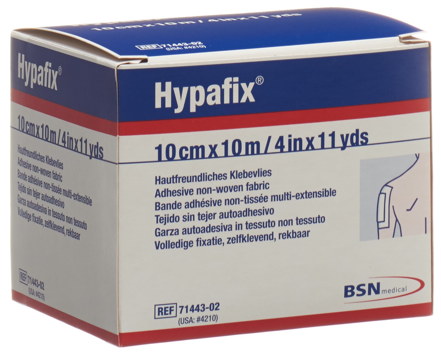 Hypafix ist ein hautfreundliches Klebevlies, welches durch seine Querelastizität anschmiegsam ist, wodurch es sich auch stark konturierten Körperpartien gut angleicht. Es kann insbesondere grossflächige Verbände an bewegten Körperpartien einfach und schnell fixieren. Dabei werden Abschnürungen und Durchblutungsstörungen verhindert.