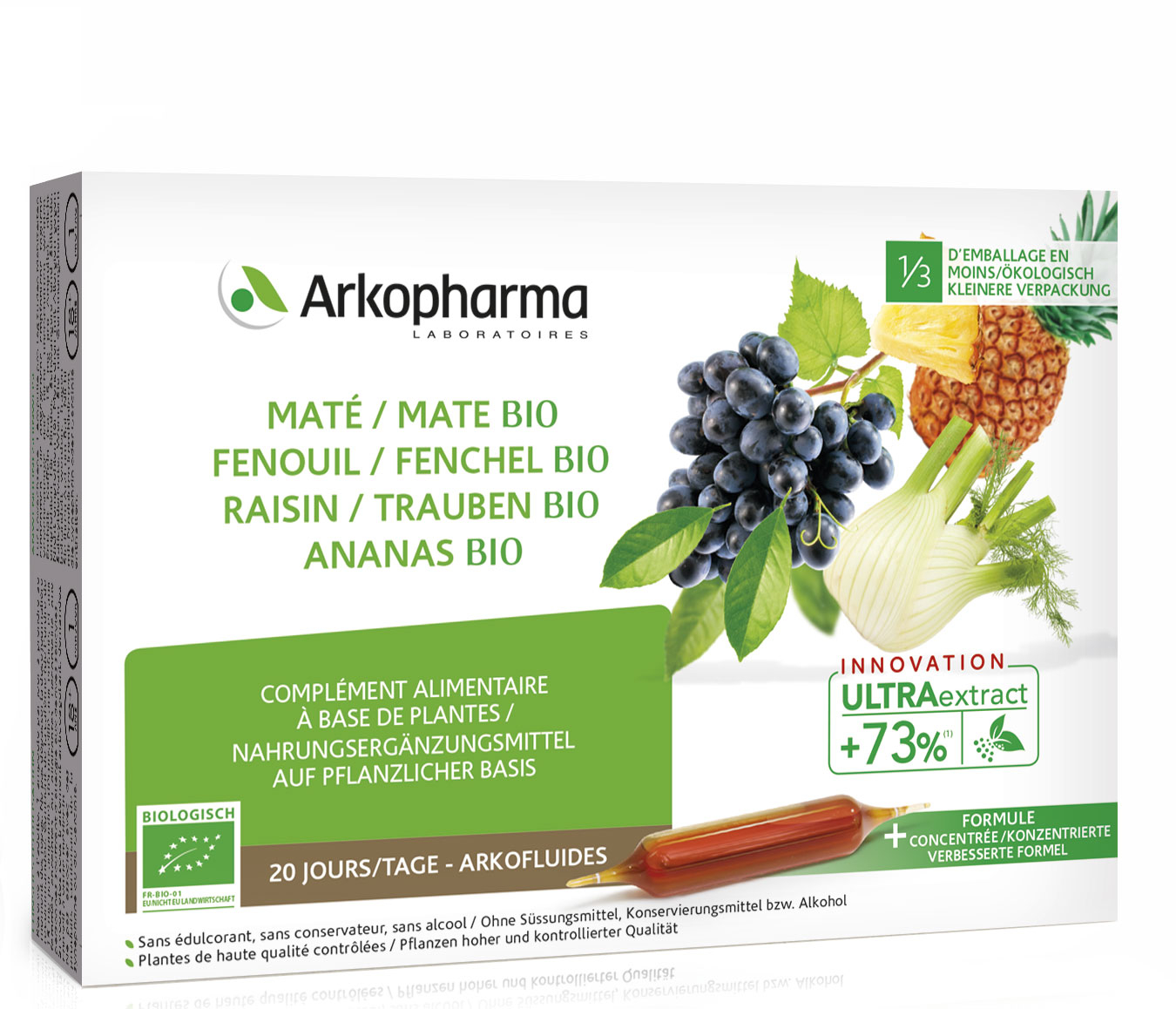 Dank seines einzigartigen Know-hows bietet Ihnen Arkopharma eine 100% pflanzliche Rezeptur, die Pflanzen aus ökologischem Landbau in einer trinkbaren Lösung garantiert ohne Süßstoffe, Konservierungsmittel und Alkohol kombiniert.