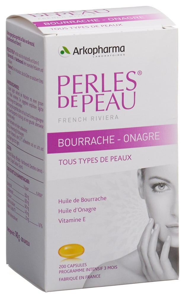 Dank ihre Know-hows haben die Laboratorien von Arkopharma Perles de PEAU® Borretsch Nachtkerzenöl speziell entwickelt: eine Formel auf der Basis von Borretschöl; Öl und Vitamin E, die von den Experten der Gruppe sorgfältig ausgewählt wurden. Borretschöl und Nachtkerzenöl liefern essentielle Fettsäuren wie Gamma-Linolensäure und Linolsäure. Vitamin E ist ein Antioxidans, das die Zellen vor oxidativem Stress schützt. Entworfen und entwickelt in Frankreich (an der französischen Riviera), garantiert das Perles de Peau® Sortiment Ihnen qualitativ hochwertige Produkte.