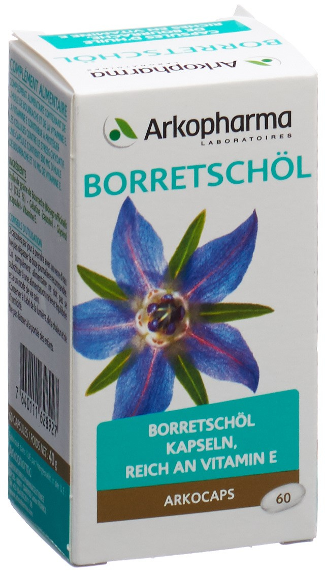 Borretschsamenöl (Borago officinalis L.). Vitamin E natürlichen Ursprungs. Hülle: Gelatine, Glycerin