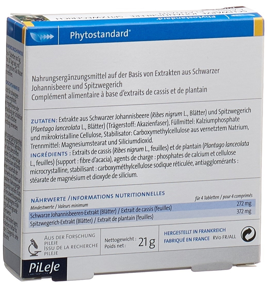 Extrakte aus Schwarzer Johannisbeere (Ribes nigrum L., Blätter) und Spitzwegerich (Plantago lanceolata L., Blätter) (Trägerstoff: Akazienfaser), Füllmittel: Kalziumphosphate und mikrokristalline Cellulose, Stabilisator: Carboxymethylcellulose aus vernetztem Natrium, Trennmittel: Magnesiumstearat..