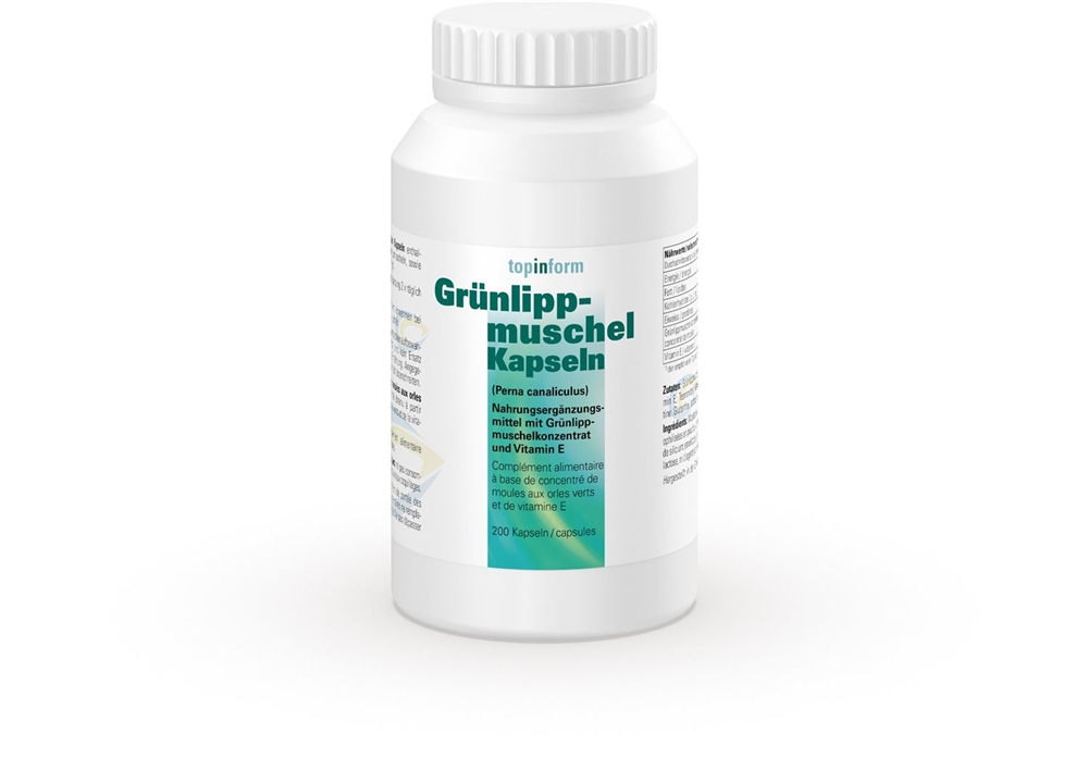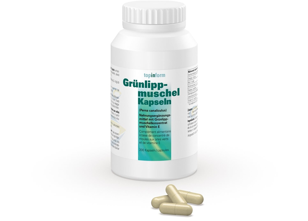 Nahrungsergänzungsmittel in Kapselform mit Grünlippmuschelkonzentrat aus Neuseeland und natürlichen Vitamin E.