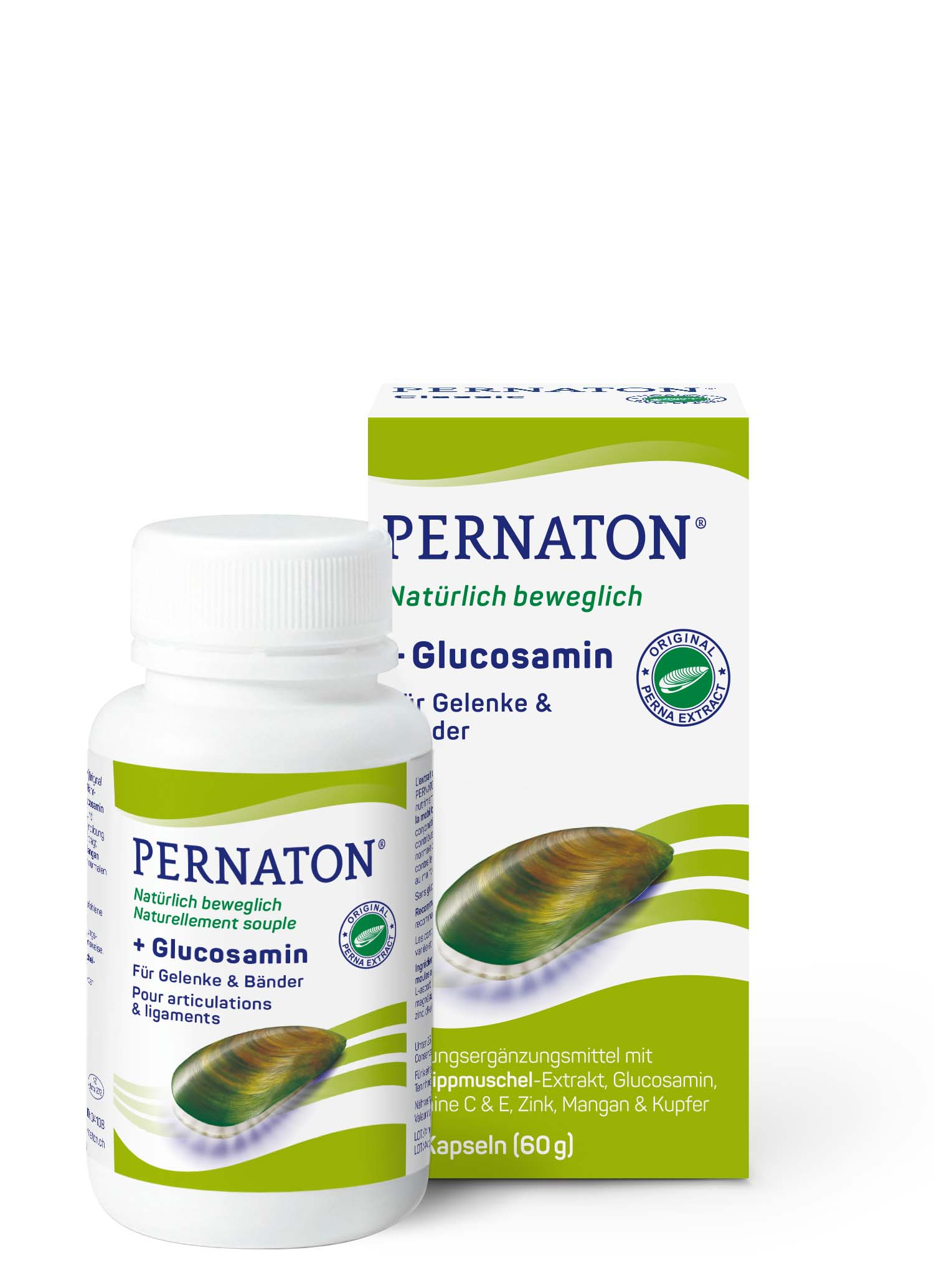 Nahrungsergänzungsmittel zur Unterstützung in chronischen Fällen und zur Erholung nach sportlichen Aktivitäten. Der neuseeländische Grünlippmuschel-Extrakt in PERNATON® (Original Perna Extract) ist zu 100% natürlich und enthält wesentliche Nähr- und Aufbaustoffe für die optimale Funktion des Bewegungsapparates: Chondroitin*, Glucosamin*, Hyaluronsäure*, Omega-3-Fettsäuren, 18 Aminosäuren, 11 Mineralstoffe und 8 Vitamine. * Als Teil der Gykosaminoglykane (GAG). Glucosamin ist ein natürlicher Bestandteil des Bindegewebes, der Bänder und des Gelenkknorpels.