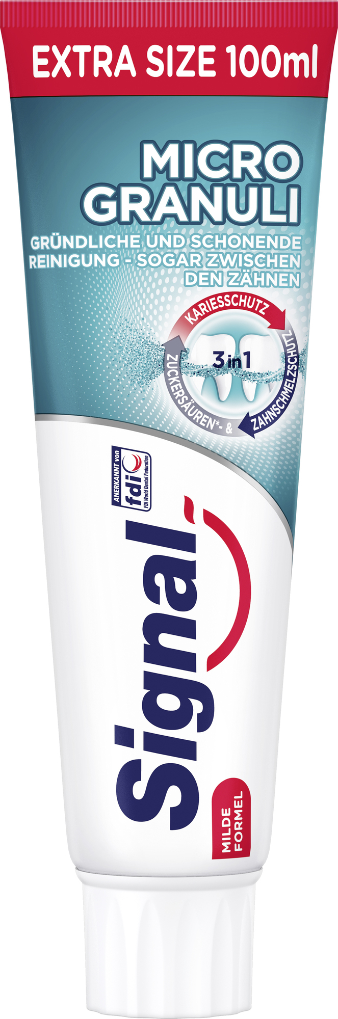 Zähnen. Die einzigartige Formulierung aus weissen und grünen Micro-Granulaten entfernt Plaque wirksam bis in die Zwischenräume Ihrer Zähne, während der hochwirksame Anti-Plaque-Wirkstoff Zinkcitrat dessen Neubildung bekämpft. Das Ergebnis: Gründliche Reinigung und nachhaltiger Schutz für Zähne und Zahnfleisch. Die FDI bestätigt, dass zweimal tägliches Zähneputzen mit einer fluoridhaltigen Zahnpasta, wie die Signal Micro-Granuli, zur Förderung der Mundgesundheit beiträgt. Signal empfiehlt: - 2x tägliches Zähneputzen - Zahnbürste alle 3 Monate wechseln - 2x im Jahr zum Zahnarzt gehen |