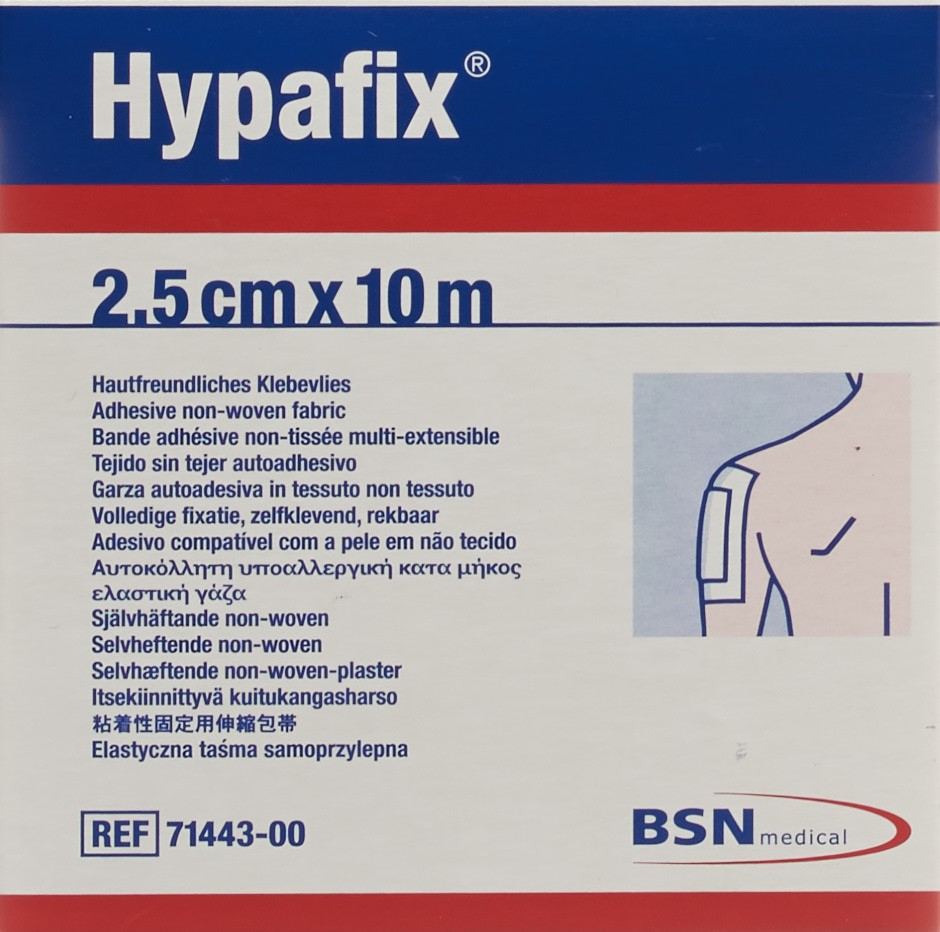 Hypafix ist ein hautfreundliches Klebevlies, welches durch seine Querelastizität anschmiegsam ist, wodurch es sich auch stark konturierten Körperpartien gut angleicht. Es kann insbesondere grossflächige Verbände an bewegten Körperpartien einfach und schnell fixieren. Dabei werden Abschnürungen und Durchblutungsstörungen verhindert.