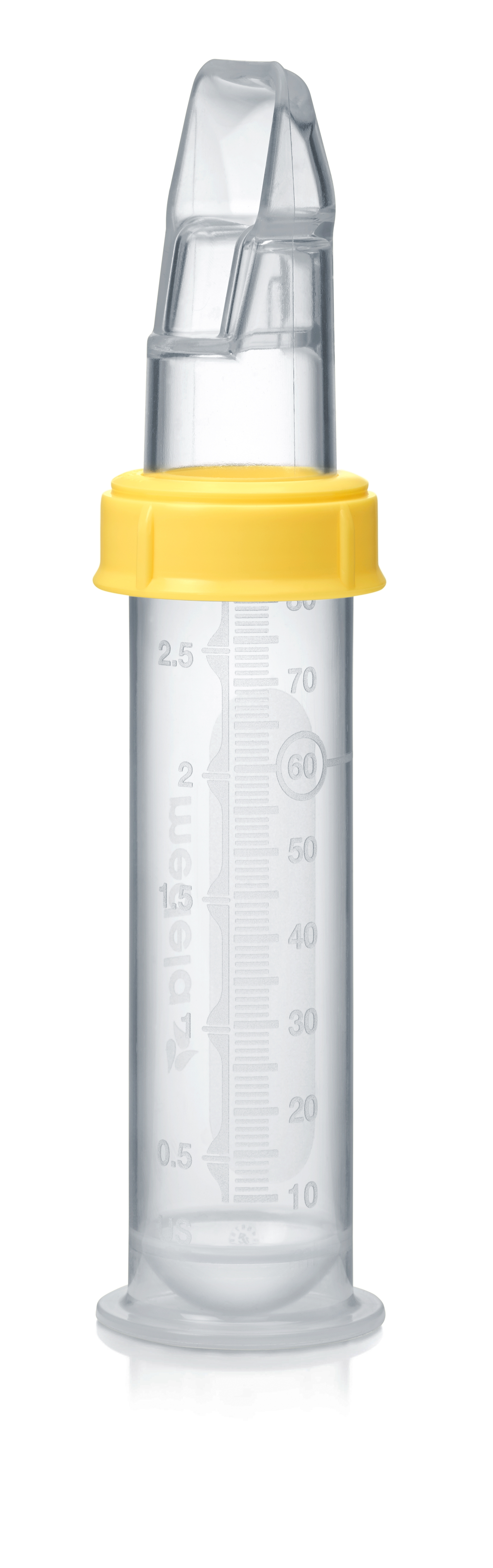 Ein Spezial-Trinkbecher mit speziell weichem löffelförmigem Mundstück für ein kurzzeitiges Füttern von schwachen Babys und Frühchen.