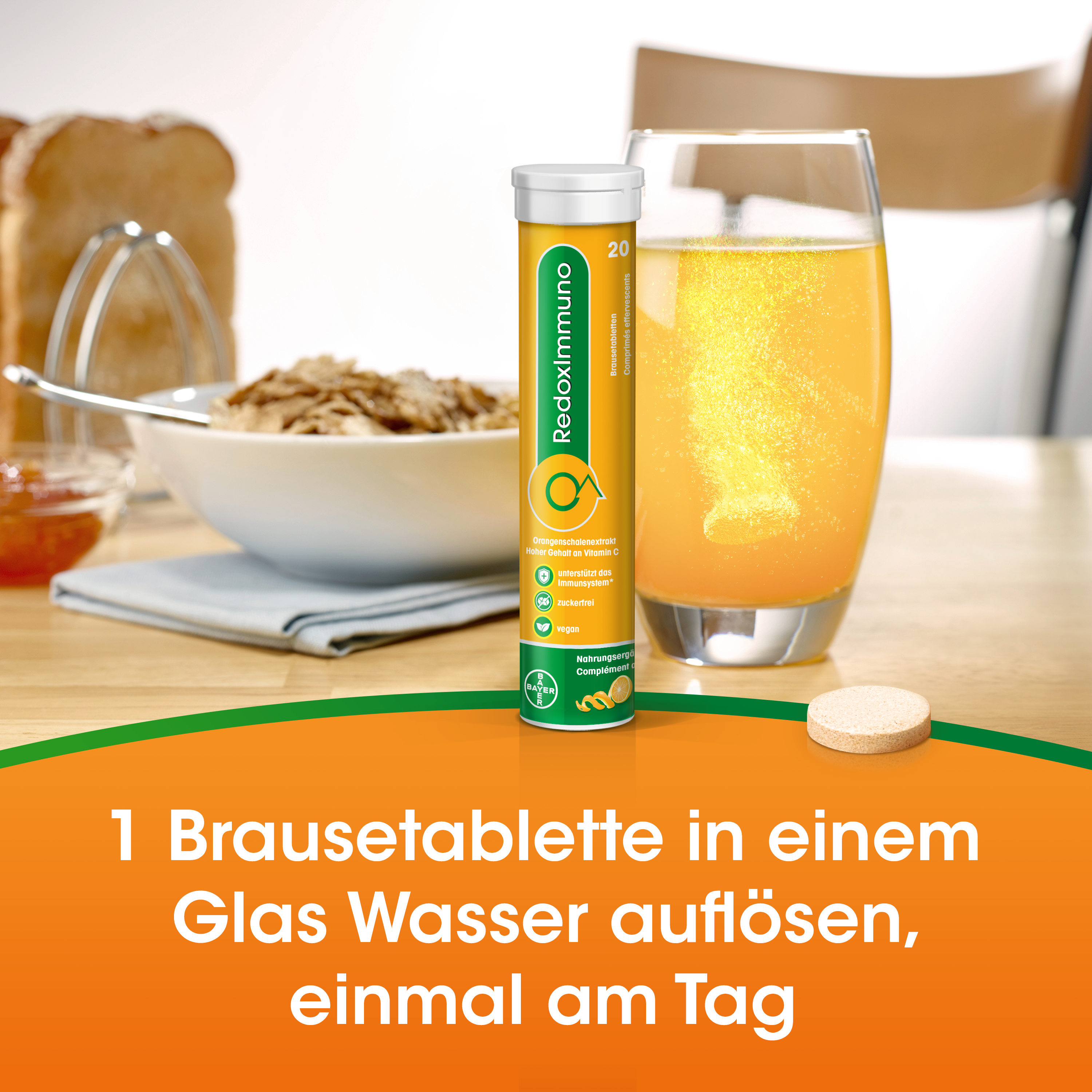 Die RedoxImmuno Brausetabletten enthalten Orangenschalenextrakt und mit 500 mg einen hohen Gehalt an Vitamin C. RedoxImmuno kann zur Unterstützung des Immunsystems ergänzend zu einer ausgewogenen Ernährung eingesetzt werden.. Geeignet für Erwachsene und Kinder ab 12 Jahren.