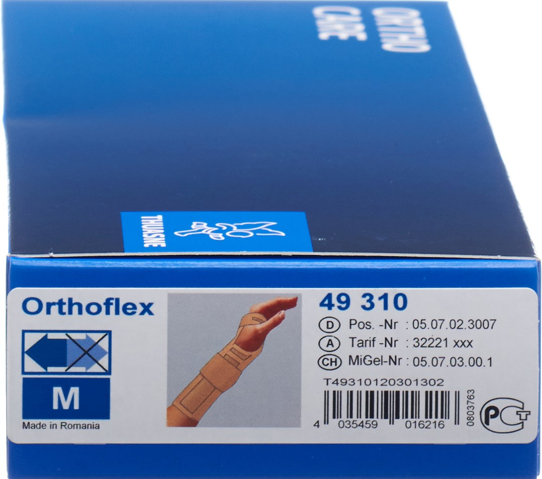 Das hautfarbene Orthoflex Handgelenkband rechts unterstützt das Handgelenk. XS, 16cm.