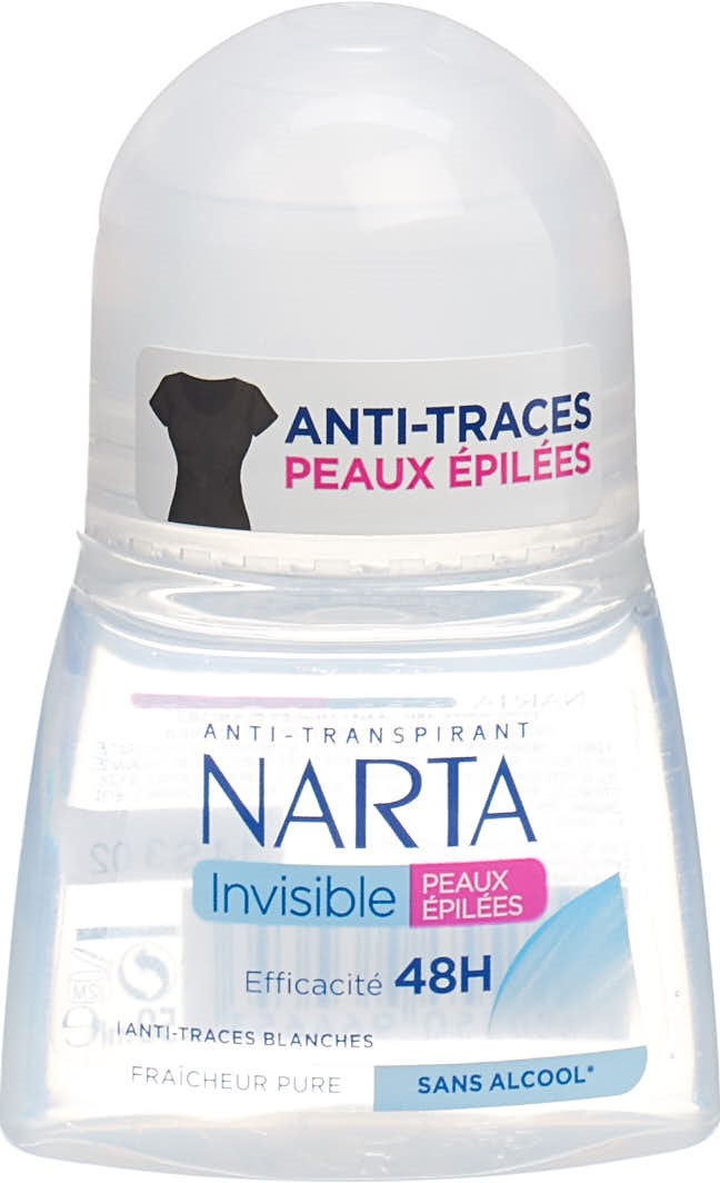 Narta Invisible Peaux Epilées ist ein Antitranspirant mit Anti-Streifen-Wirkung, das weisse Spuren auf der Haut und auf der Kleidung beseitigt. Seine alkoholfreie Formel respektiert Ihre Haut und den natürlichen Mechanismus des Schwitzens.