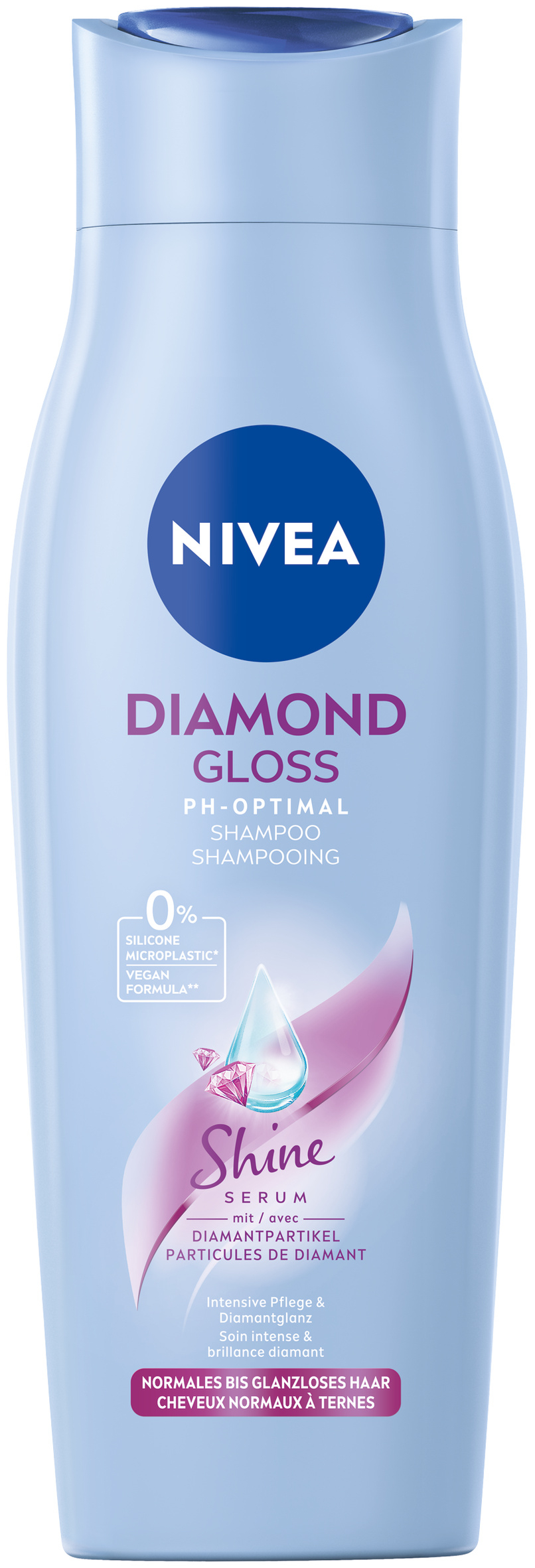Das milde, pH-hautneutrale Nivea Hair Diamond Gloss Care Pflegeshampoo mit Diamantpartikeln und Nähr-Essenzen verleiht normalem, glanzlosem Haar funkelnden Diamantglanz und intensive Pflege.