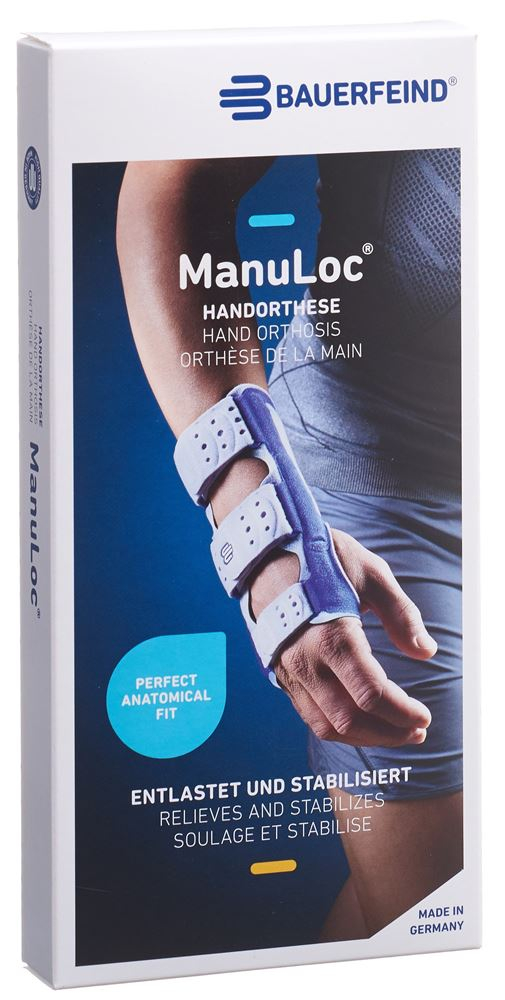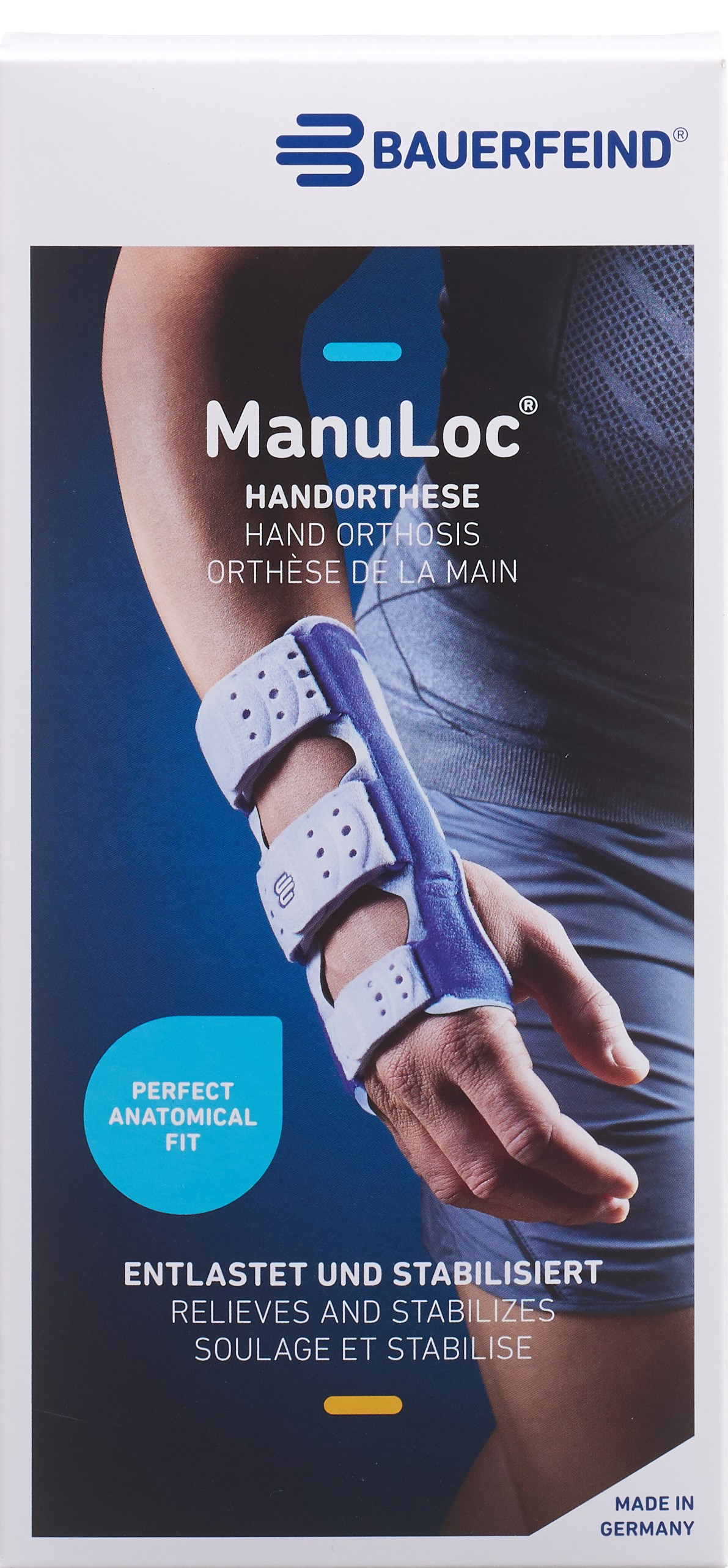 Die ManuLoc Stabilorthese schont nach Prellungen oder Verstauchungen die Hand und stützt sie, sodass Reizungen abklingen können. Die Konstruktion gibt den nötigen Halt und erhält unter anderem durch ihre grosszügige Daumenöffnung die Bewegungsfreiheit der Finger. Beim Tragen werden zusätzlich Bewegungen, welche Schmerzen auslösen könnten, verhindert – die Hand kann aber weiterhin zugreifen. Die Gurtenden mit integriertem Rückzugstopp ermöglichen ein schnelles Fixieren ohne viel Kraftaufwand. Durch das atmungsaktive Material kann die Feuchtigkeit nach aussen gelangen, sodass sich unter der Orthese kein Schweiss sammeln kann. Ihr flaches Design aus Mikroklett-Velour lässt sich zudem problemlos unter der Kleidung tragen, zieht keine Fäden und macht sie zudem besonders leicht.