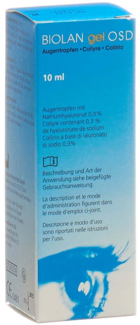 Die Biolan Gel OSD Augentropfen mit 0.3% Natriumhyaluronat spenden trockenen Augen Feuchtigkeit und pflegen sie. Sie sind auch für Kontaktlinsenträger geeignet und enthalten keine Konservierungsstoffe.