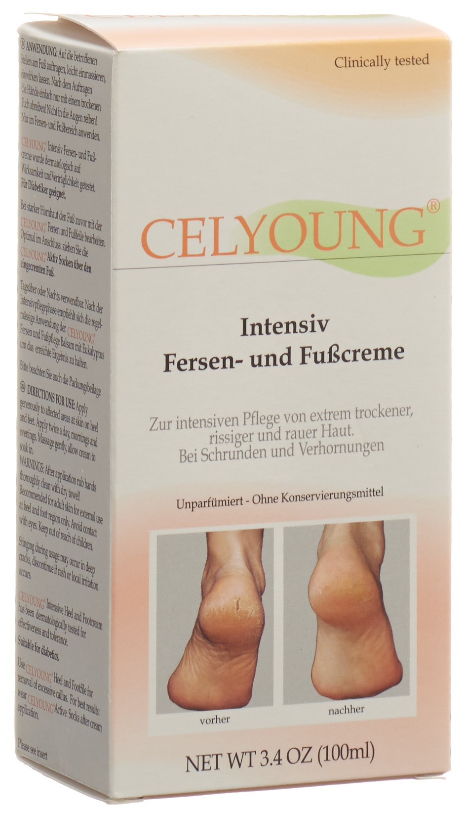 Die Celyoung Intensiv Fersen- und Fusscreme dient der intensiven Pflege von extrem trockener, rissiger und rauer Haut sowie bei Schrunden und Verhornungen.