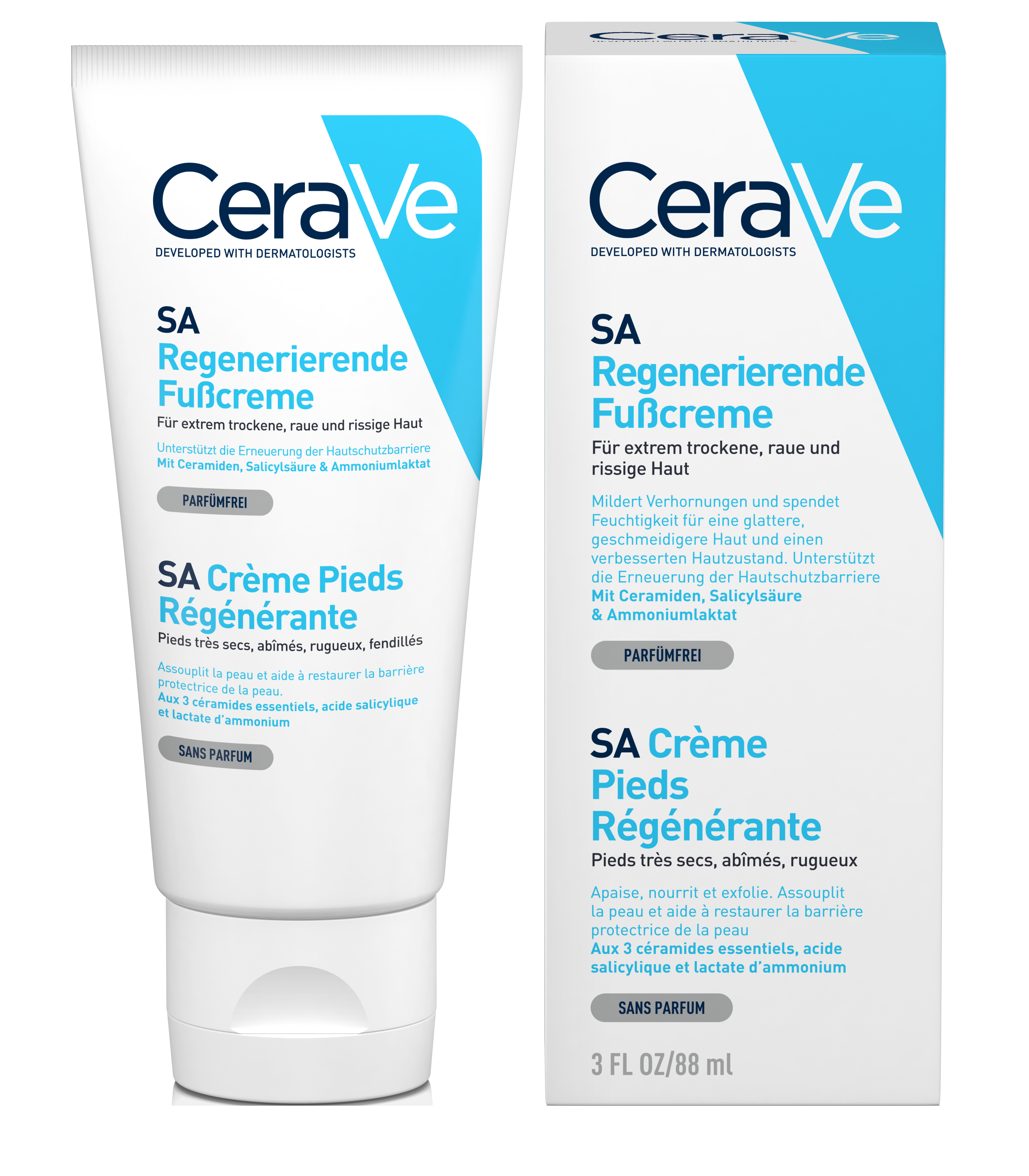 CeraVe SA Regenerierende Fusscreme enthält eine Kombination aus drei essenziellen Ceramiden 1, 3 und 6-II, die die besonders angegriffenen und trockenen Hände beim Aufbau einer gesunden Hautschutzbarriere unterstützt. Durch Salicylsäure wird Hornhaut abgetragen. Die aktiven Wirkstoffe wie Ceramide und Hyaluron werden durch die patentierte Wirkstoff-Freisetzung über den Tag freigesetzt und geben der trockenen Haut ihr Wohlbefinden zurück.Anwendung